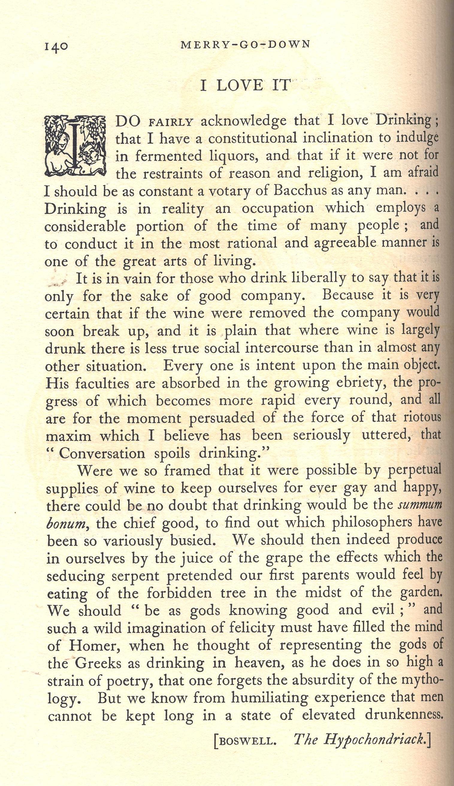 Boswell‘s piece (late eighteenth century) is especially insightful. As he suggests, “Were we so framed that it were possible by perpetual supplies of wine to keep ourselves for ever gay and happy, there could be no doubt that drinking would be the summum bonum, the chief good, to find out which philosophers have been so variously busied.”