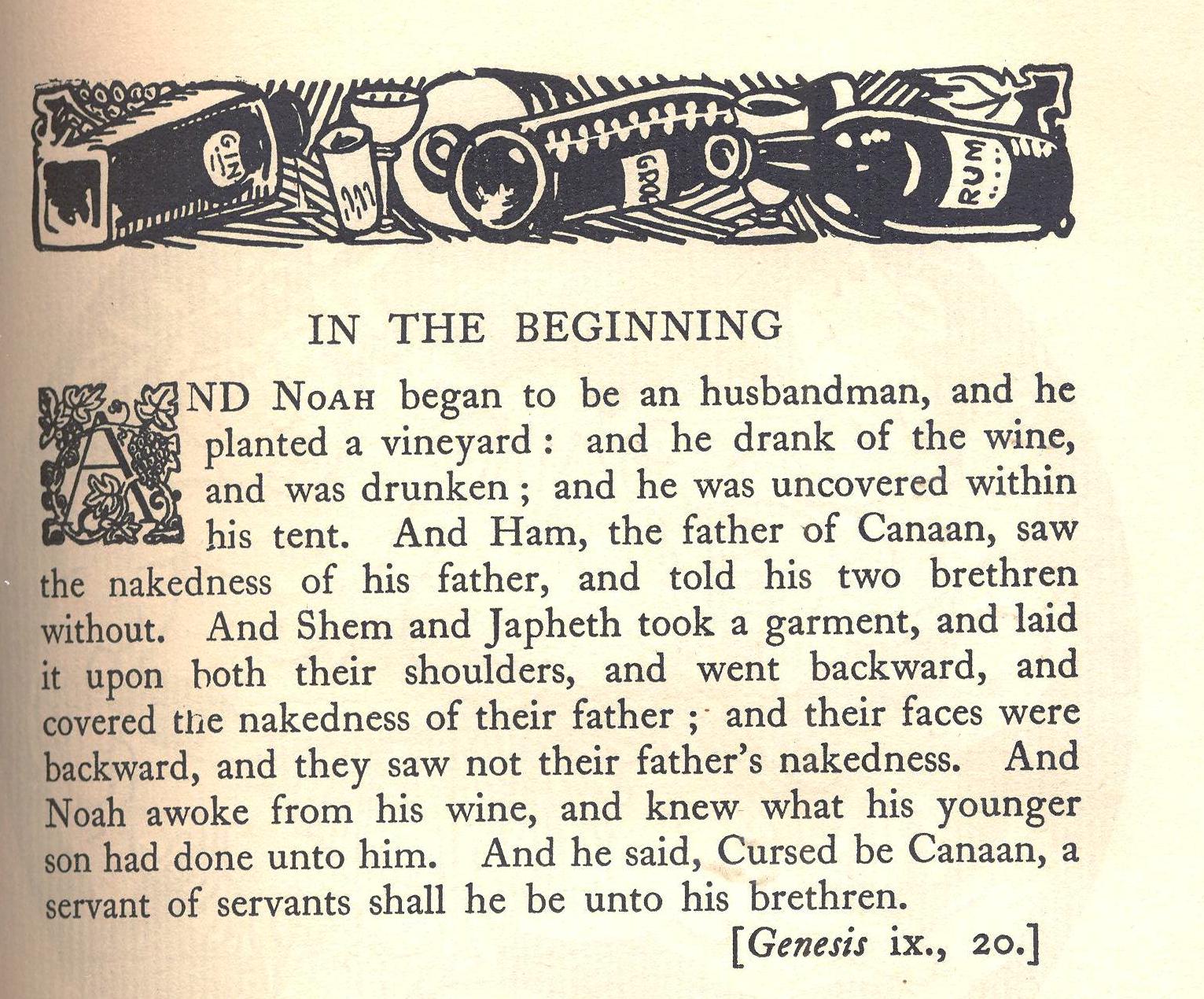 The book, as promised, takes us on a delightful tour of drunkenness through the ages. We begin at the beginning: Noah. Did you know that Noah was a drunkard? Well, he was.