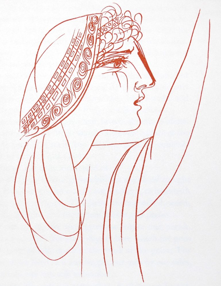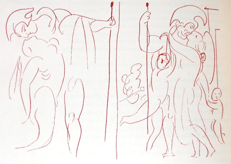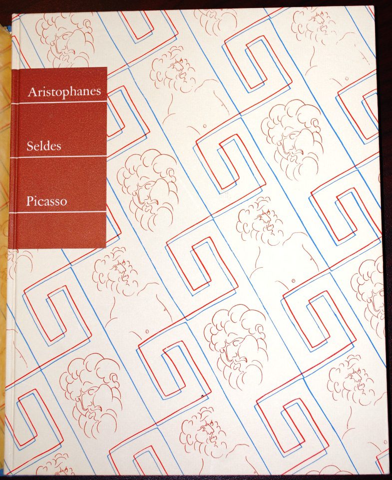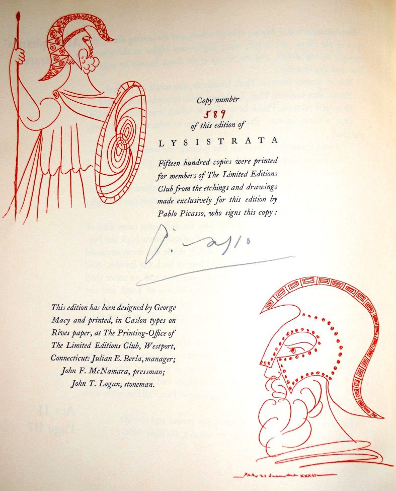 Aristophanes died some 23 centuries before Carl and Edith purchased their LEC copy of his Lysistrata, so there’s no telling what he would have though about Pablo Picasso’s illustrations therein — but we love them to pieces, and think this is one of the most gorgeous, well-designed, fully-integrated books produced by the LEC.