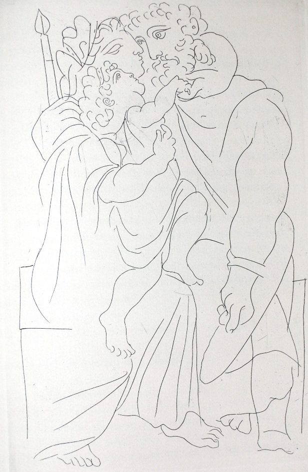 Matisse’s illustrations from Ulysses do not depict James Joyce’s Dublin, but rather evoke Leopold Bloom’s one-day odyssey through that city’s streets by making explicit the subtle structural parallels that Joyce wove between Ulysses and Homer’s Odysseus. So while the section paralleling the Cyclops’ tale in Ulysses is set in Barney Kiernan’s pub, where Bloom is berated by an un-named, anti-Semitic “citizen,” Matisse illustrates the scene with a literal depiction of the blinding of the Cyclops Polyphemus.
