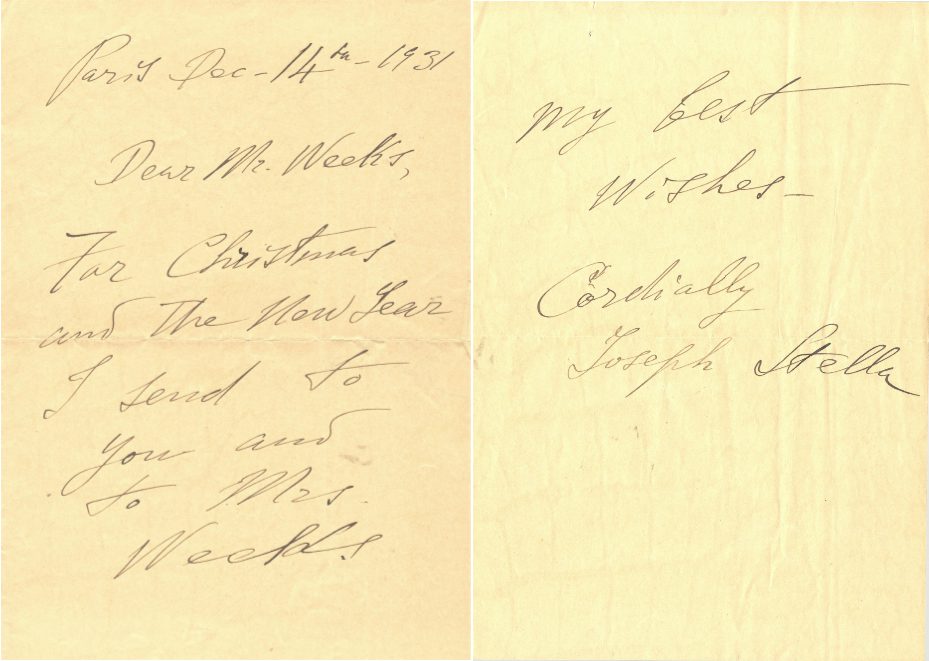 In addition to sending out holiday cards, the Weekses also received them from a variety of friends and acquaintances. Joseph Stella, a prolific Italian-American artist of the twentieth century, maintained a long relationship with Carl and Edith. Correspondence over the years between the Weekses and the Stellas often included a Christmas greeting.