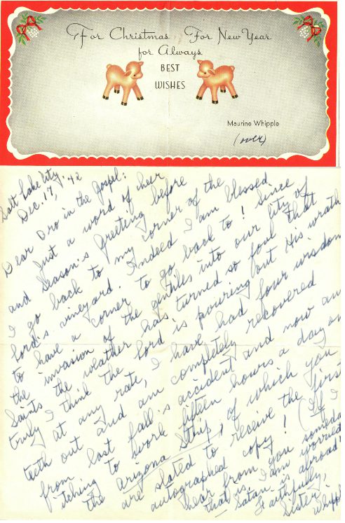 Another holiday greeting, addressed to Carl at his office, came from the writer Maurine Whipple in 1942. Extant correspondence between Whipple and Weeks was quite extensive, and suggested a unique relationship that was reflected in her 1942 Christmas card.
