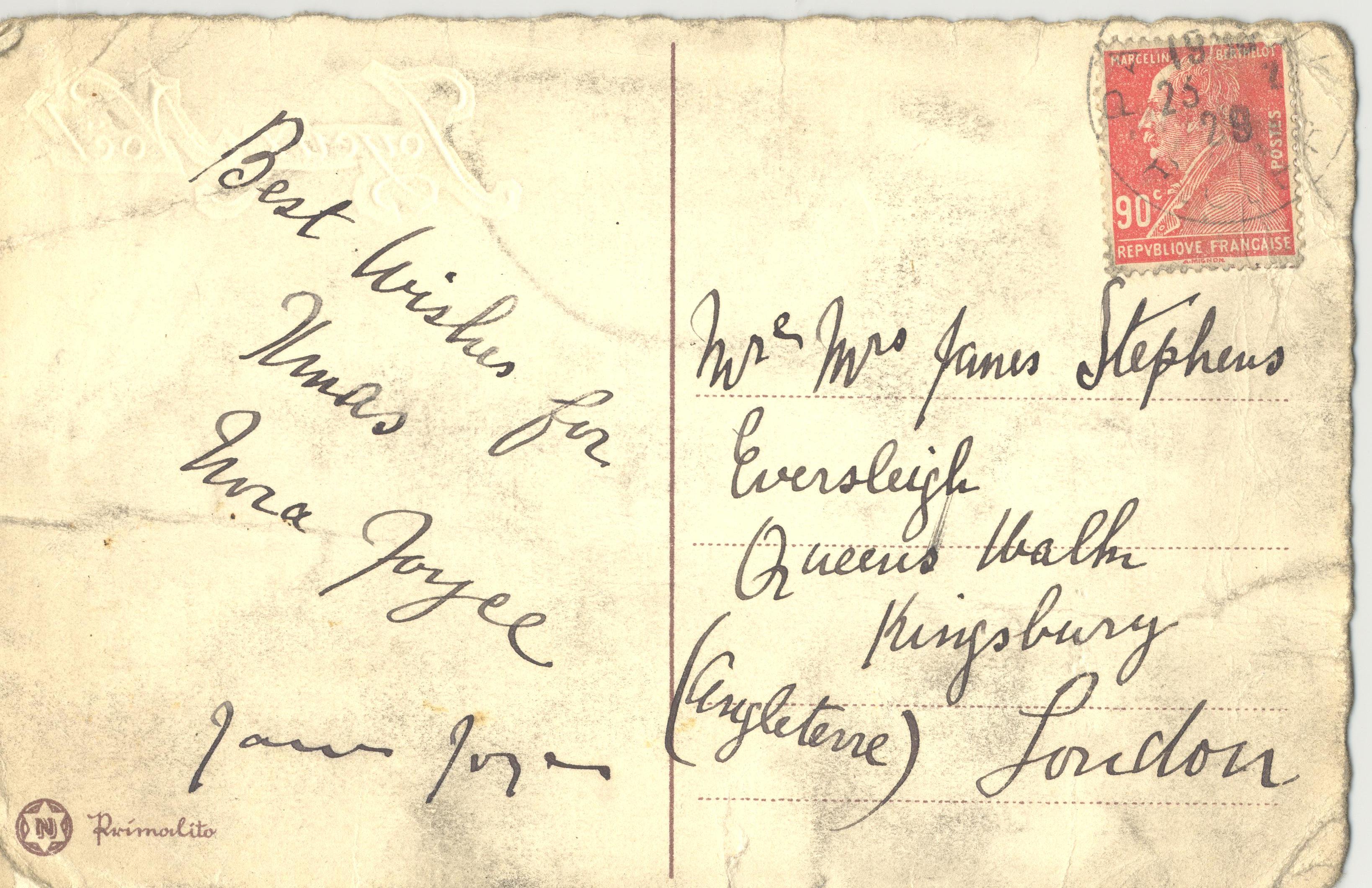 This postcard, held here at Salisbury House, surely dates to this very time, during which Joyce and Stephens cemented their friendship and struck their agreement regarding Finnegan’s Wake.