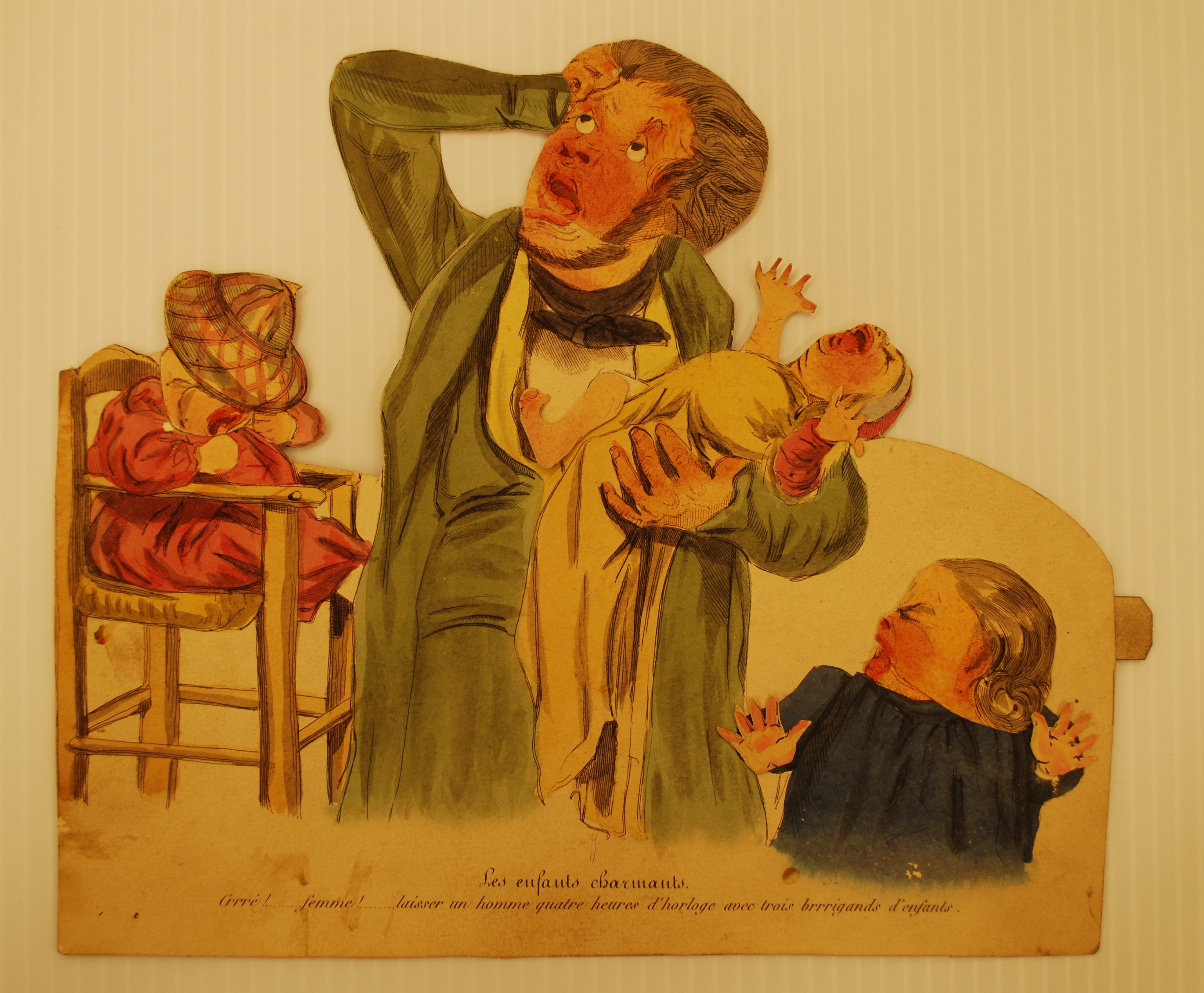 This first set of Daumier images below are both amusing and puzzling. We do not yet know who created these cutouts of his caricatures, or who added paper tabs to the reverse of the cutouts that allowed figures’ arms and other appendages to be moved back and forth. The cutouts seem to be Daumier’s images, anonymously translated into folk art. Put simply: they’re awesome.