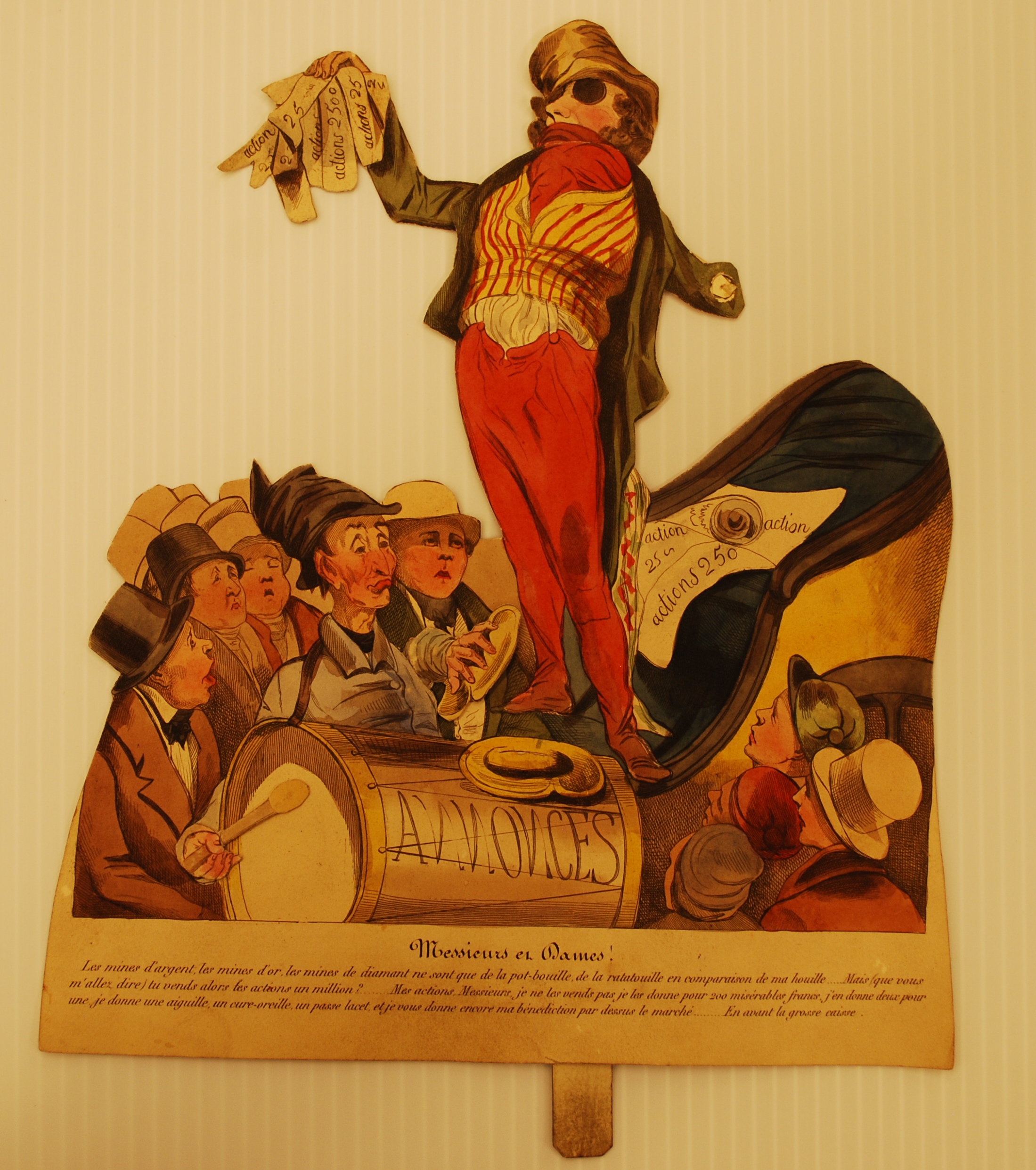 Translation: Ladies and gentlemen! Silver mines, gold mines, diamond mines are only thin gruel and stale rolls in comparison with coal . . . But even so, (you’re going to say), you’re selling your shares for a million? . . . I’m not selling my shares, gentlemen, I’m giving them away for 200 miserable francs, I’m giving two for every one, I’m giving away a needle, an ear-pick, a bodkin, and what’s more, I give you my blessing into the bargain. Bring out the big drum!