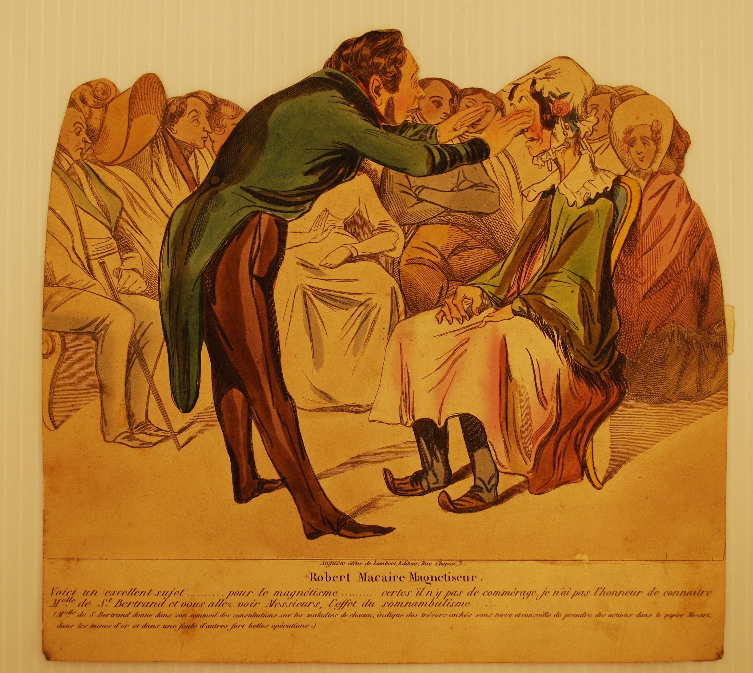 Translation: Robert Macaire hypnotist. Here is an excellent subject……… for hypnosis……. Certainly ! there is no connection between us, I do not have the honor of knowing Mademoiselle de St. Bertrand and you will see gentlemen, the effect of sleepwalking… (in her sleep Mademoiselle de St. Bertrand gives diagnoses on everyone’s diseases, advocates hidden underground treasures and gives investment advice to Mozart paper company, in gold mines and a host of other very fine operations).