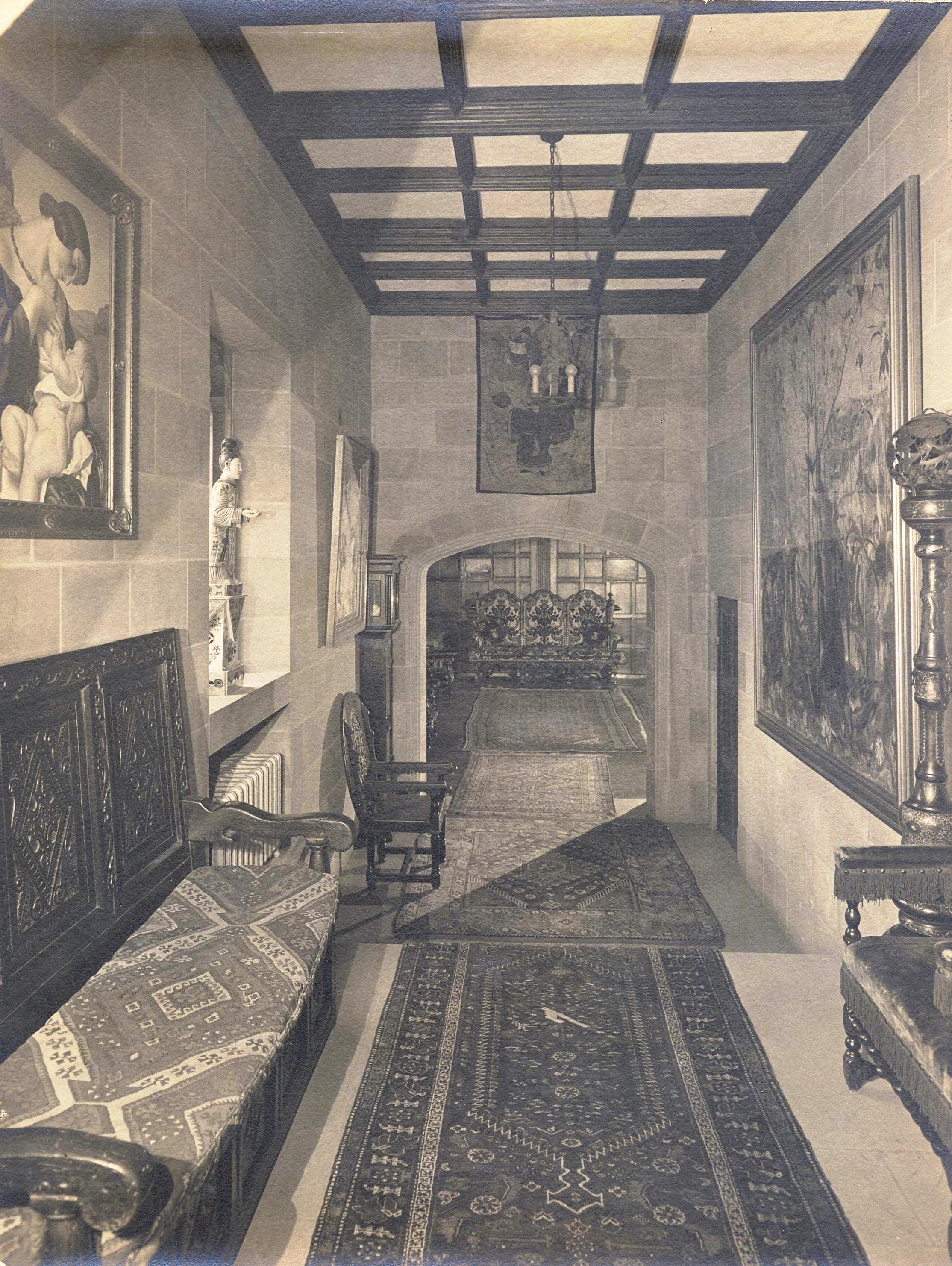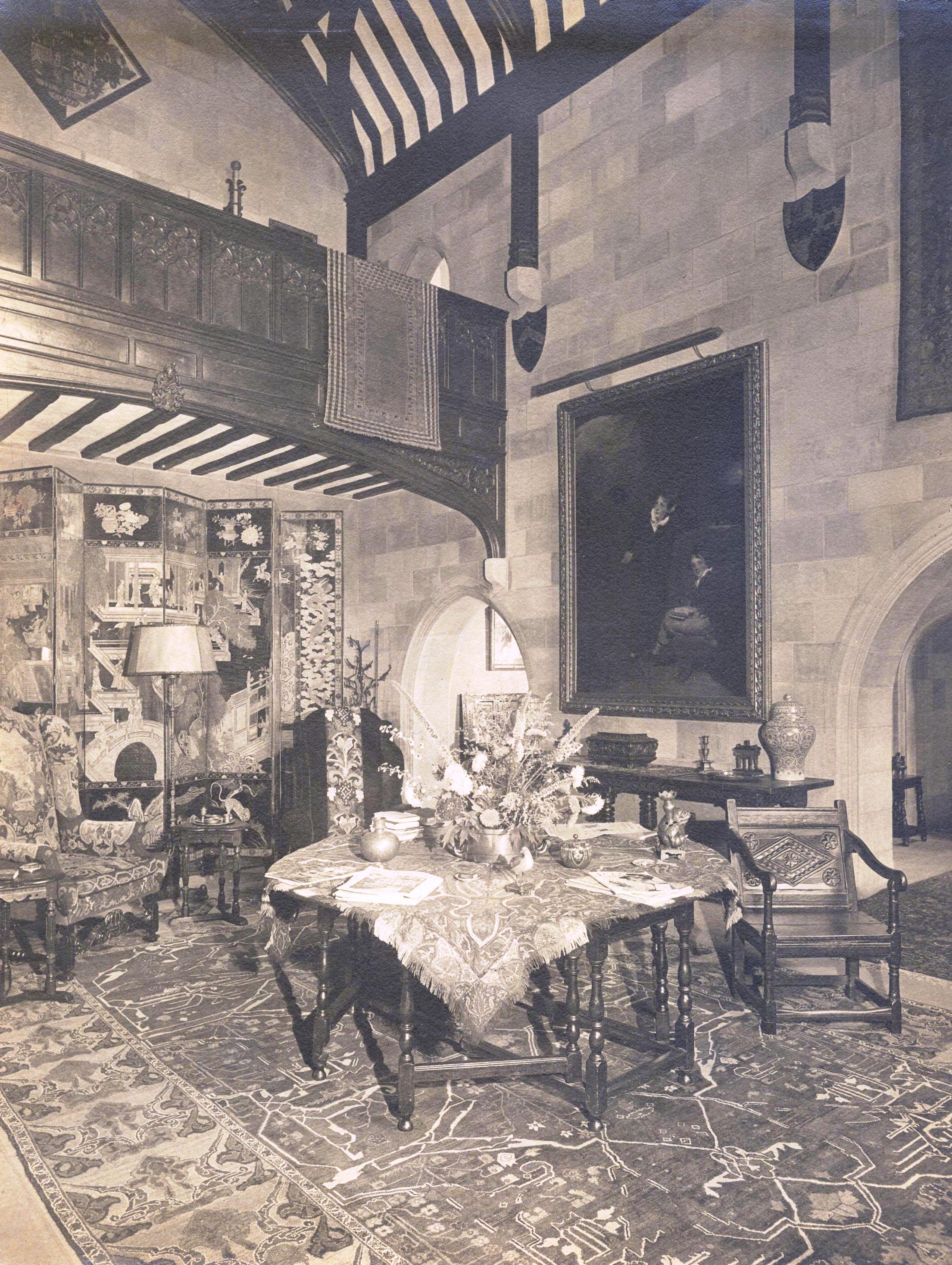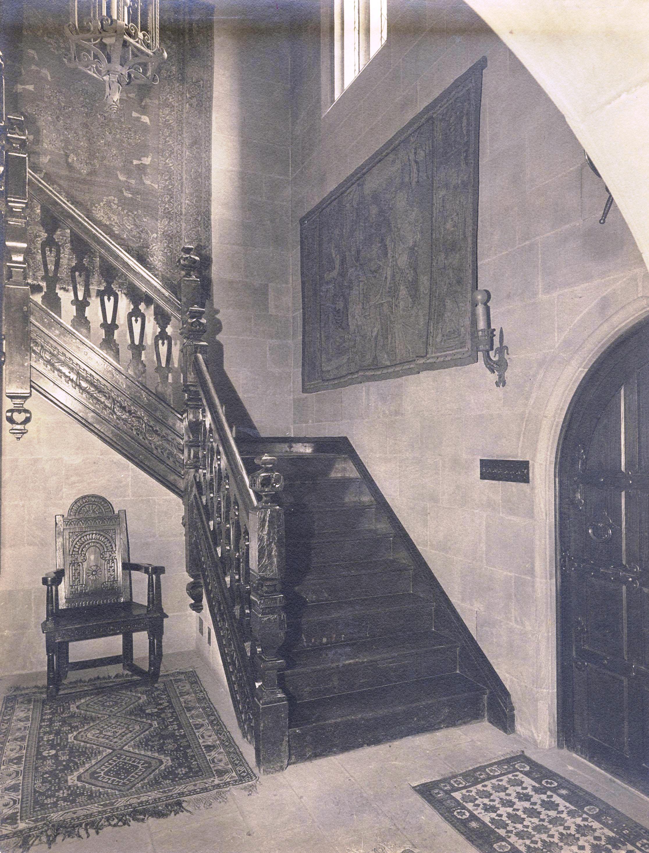 Not long after this photograph was taken, the Weekses added an elaborate runner to the stairs that included their family crest. A sixteenth-century suit of armor eventually replaced the chair pictured here as well.