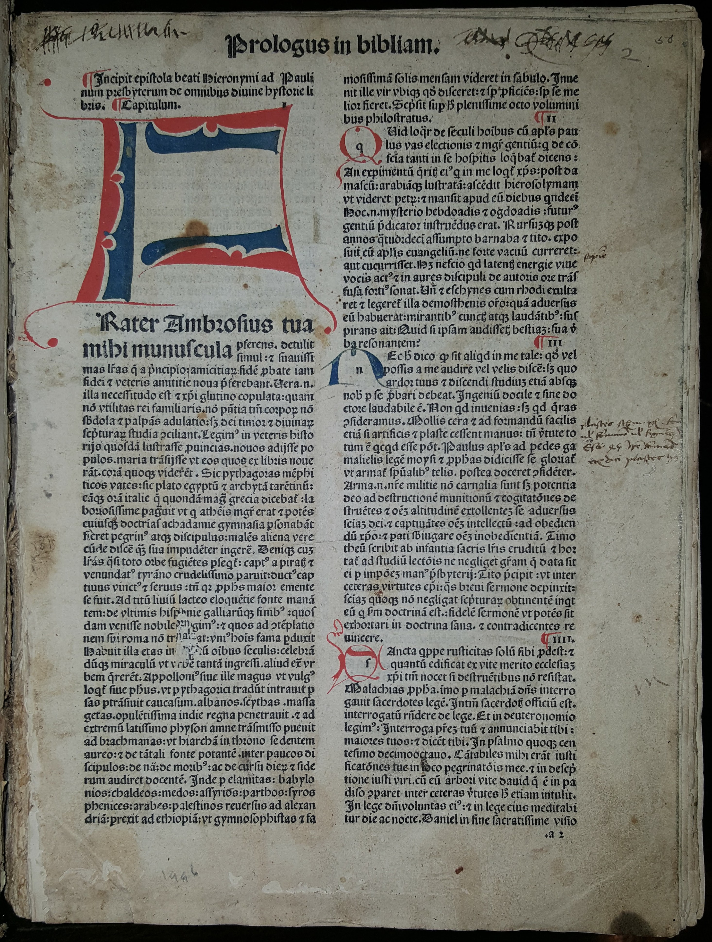 Back at Strassburg in 1472, Johann Mentelin was hard at work on a mammoth production of Nicholas of Lyra’s Postilla super totam Bibliam, which was the first major work of commentary on the bible. Some accounts suggest that Mentelin learned his craft from Gutenberg himself. At any rate, the book produced by Mentelin is a show-stopper. It includes decorated capitals, rubrication, innovative design and, delightfully, annotations from some long-ago reader.