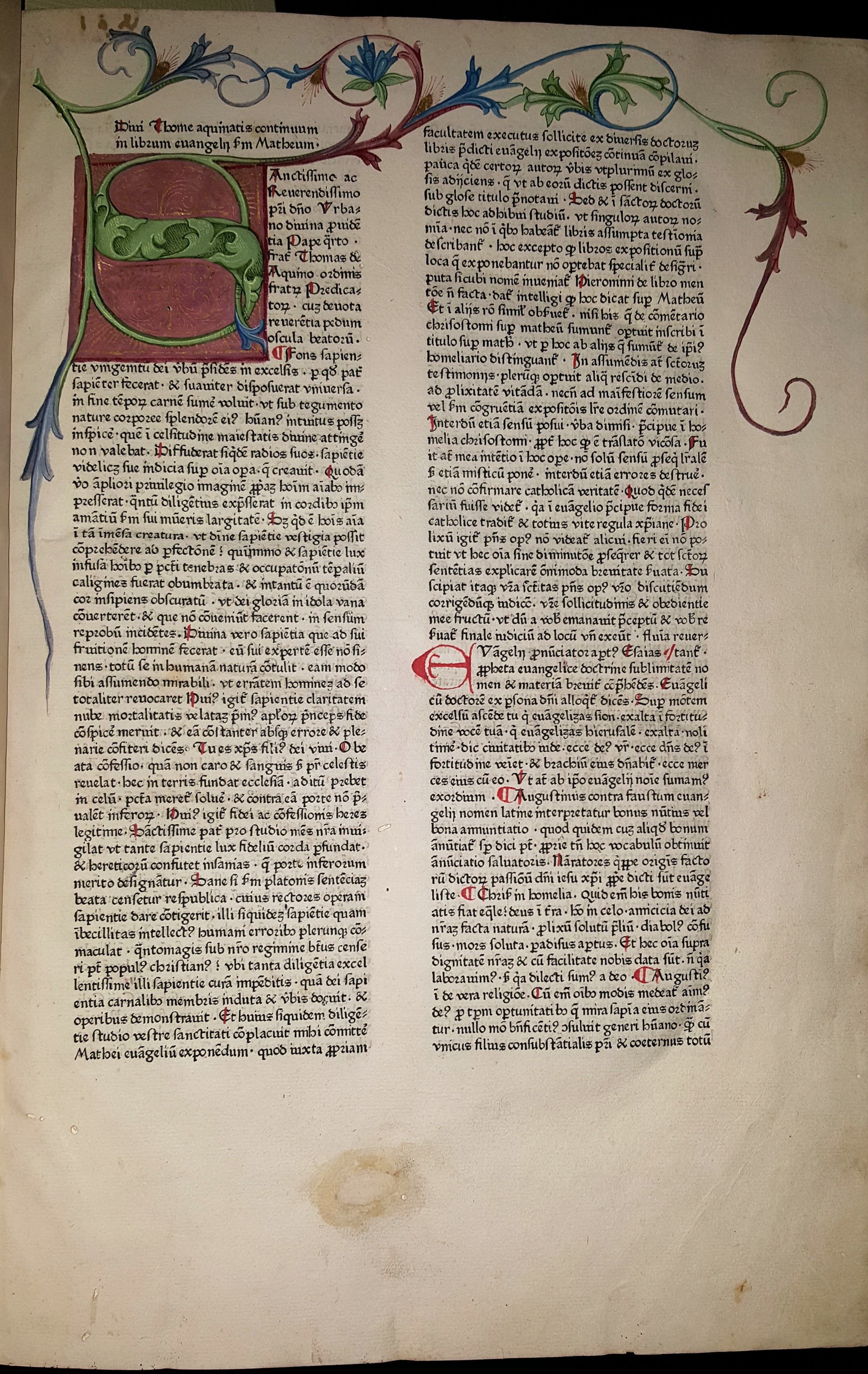 The works of Thomas Aquinas, the prolific Roman Catholic priest, philosopher, and theologian, proved a popular subject for many early printers. Anton Koberger, who established the first printing press in Nuremberg in 1470, produced in 1475 a gorgeous edition of Aquinas’ Catena aurea in quatuor Evangelia (basically, a commentary on the four Gospels). The opening page of the book is a stunner.