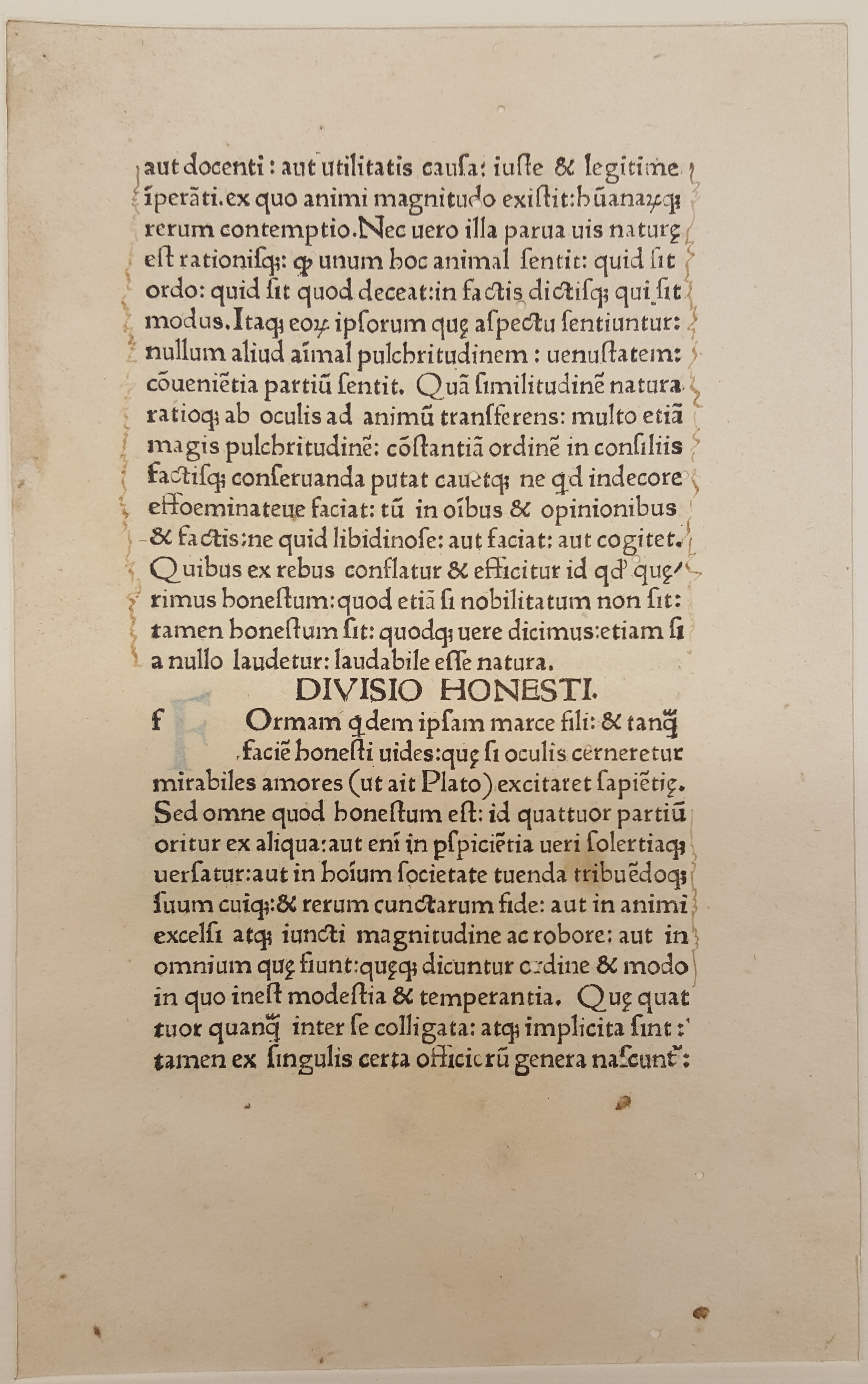 Gutenberg worked primarily in Mainz, a city in modern-day Germany. Soon thereafter a robust trade in printing emerged in Venice, where deep Italian pockets bankrolled book production for generations. Two Bavarian brothers, John and Wendelin de Spire, established one of the first presses in Venice in 1469. The incunabula leaf pictured here was printed by Wendelin in 1472 and is from an edition of Cicero’s On Duty.