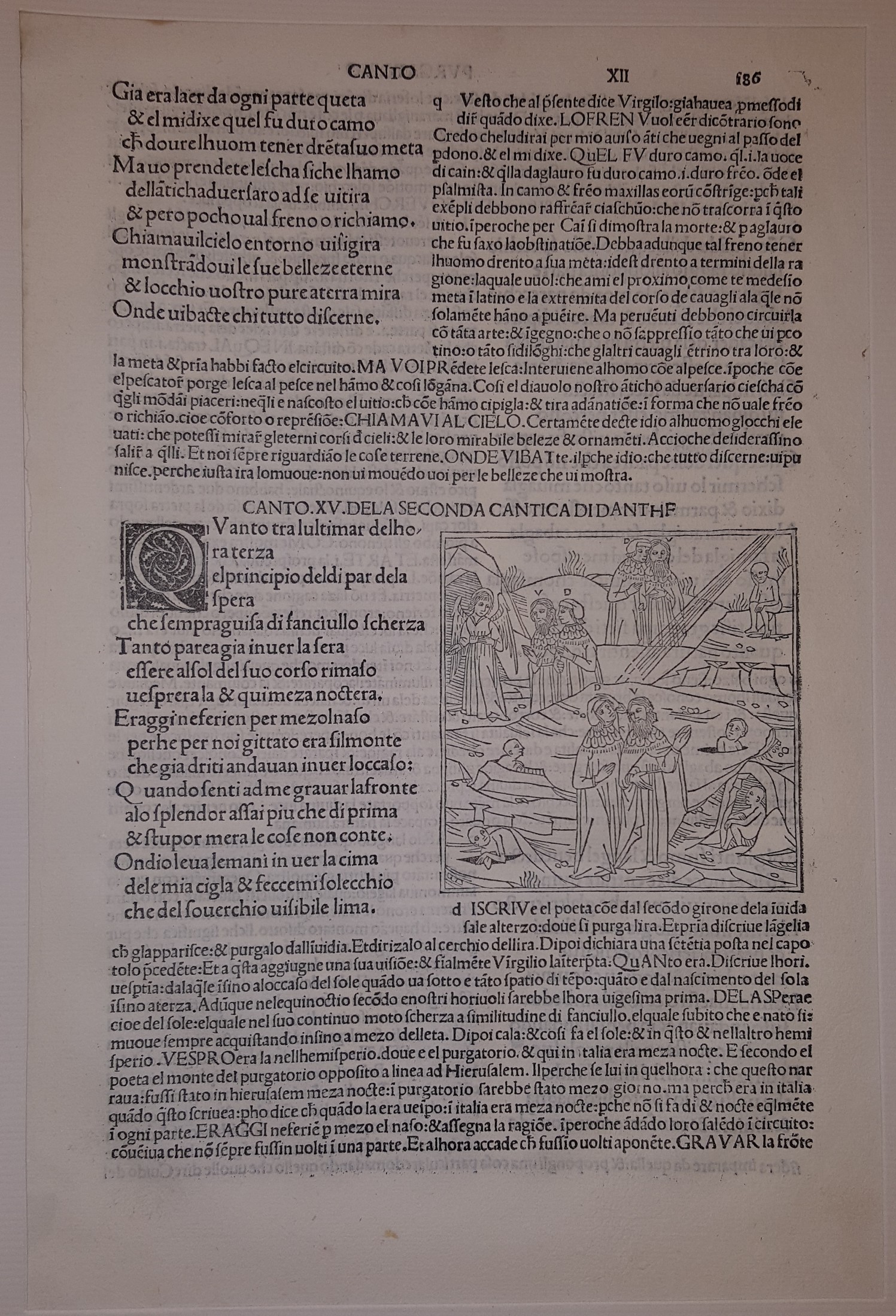 Dante Alighieri’s Divina Commedia, completed in 1320, remains a classic in world literature. This incunabula leaf is part of the complete Divina Commedia printed in Venice by Petrus de Piasio in 1491.
