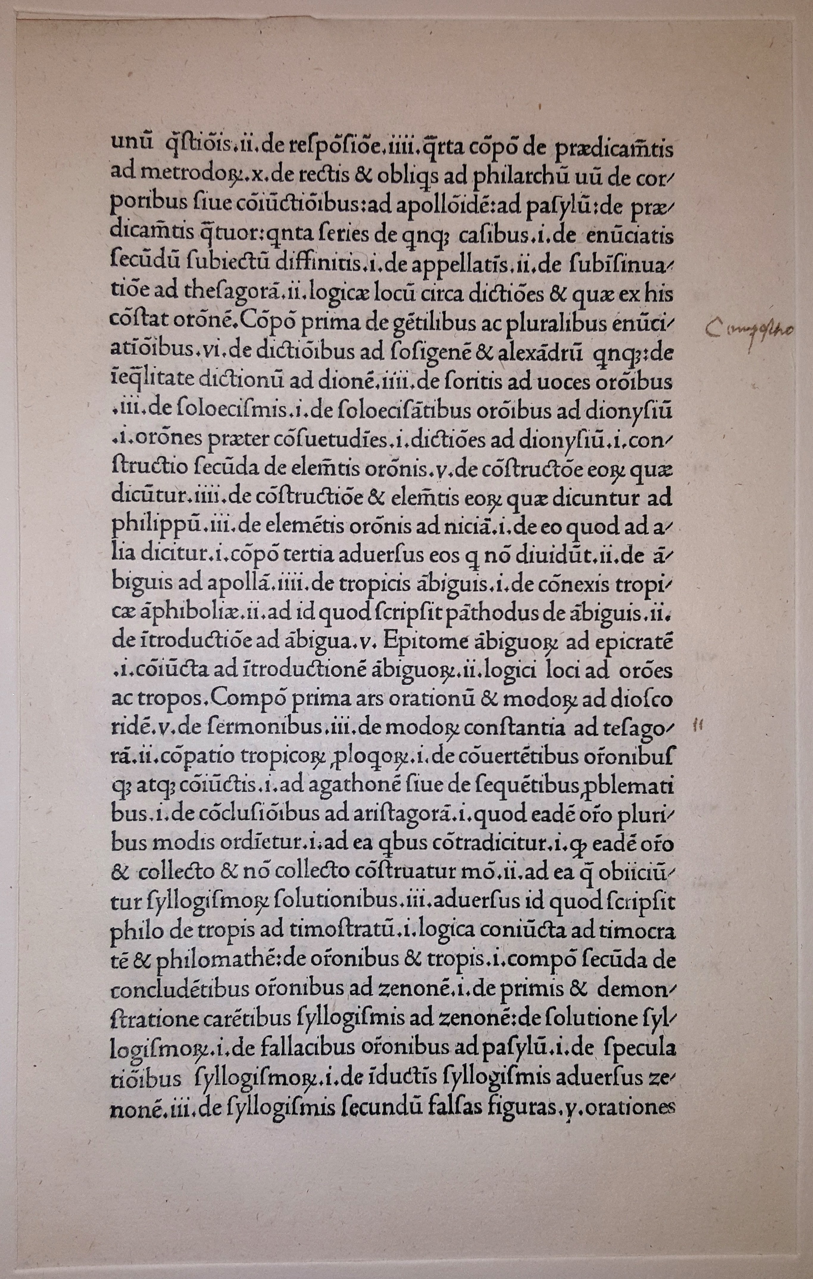 Venice in 1475 was a wonderful confluence of geography and talent: in addition to the de Spire brothers, Nicolas Jensen, roundly considered one of history’s greatest printers and typographers, turned out beautiful volumes from his Venetian workshop. The leaf pictured is from Jensen’s edition of Diogenes Laertius’ Lives of the Philosophers remains representative of his incomparable design and execution.