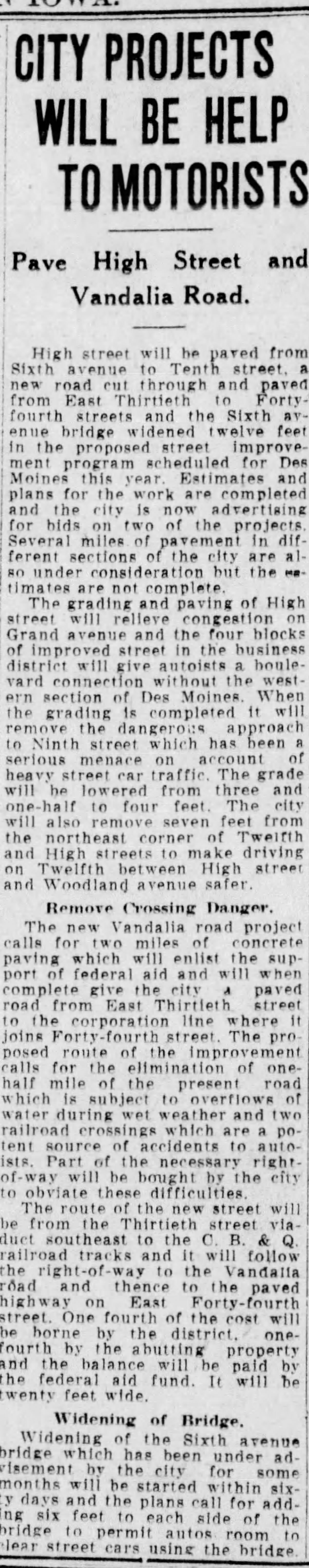 In the summer of 1923, Carl Weeks was venturing home after a day at the Armand Company factory and came upon workers tearing up High Street, located in downtown Des Moines. High Street had been approved for new paving in February of 1923 to improve grading and make safer intersections.