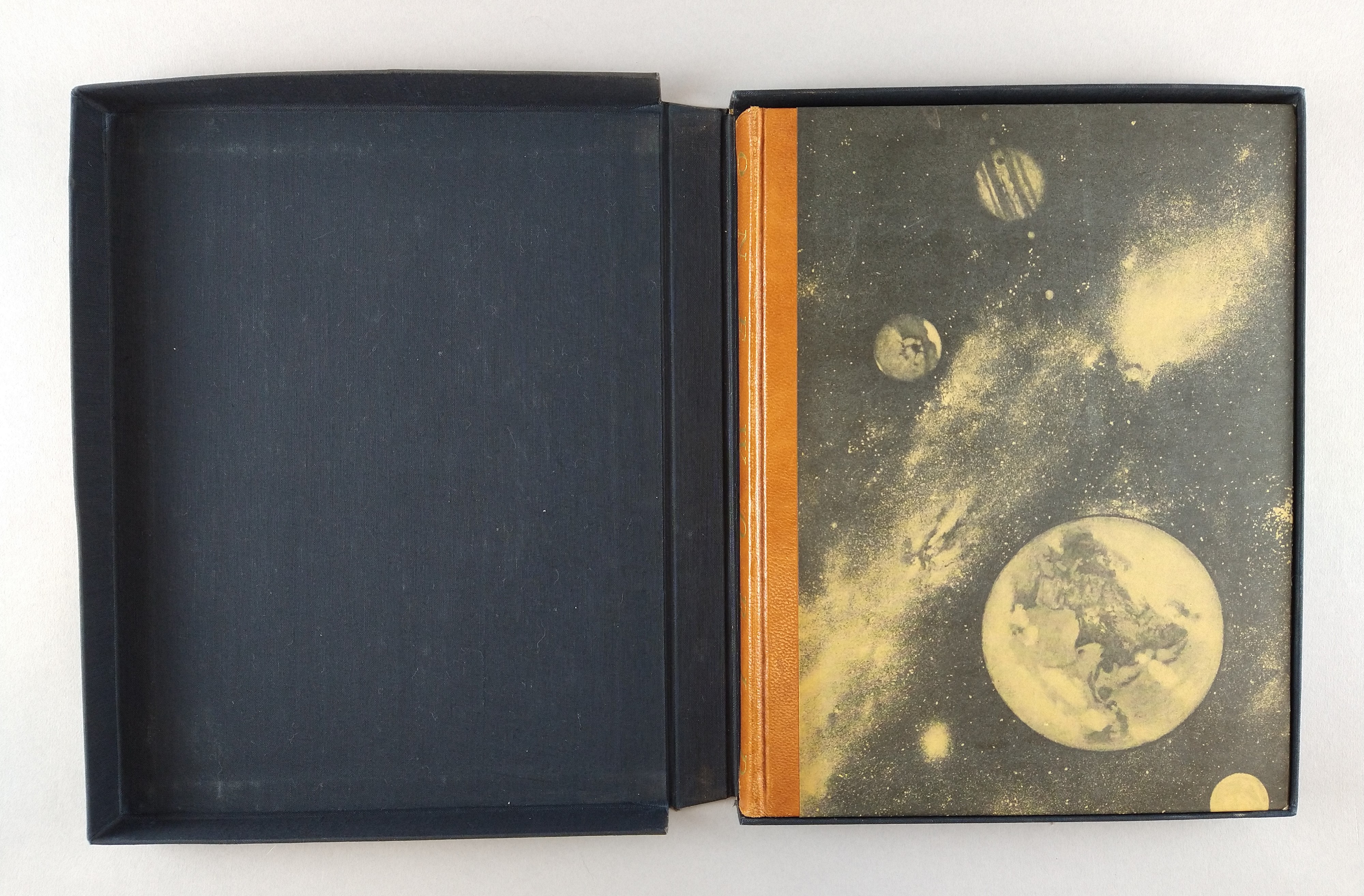 The volume on display was produced by the Limited Editions Club in 1944 as a photographic album edition. Willkie’s groundbreaking account is accompanied by photographs assembled from press agencies and photographers around the world to document “the faces and the places that Willkie saw”. Designed by George Macy, the book was printed and bound by the American Book-Staford Press to include a leather spine and a reproduction of a painting of the cosmos by D. Owen Stephens. All 1500 copies are signed by the author.